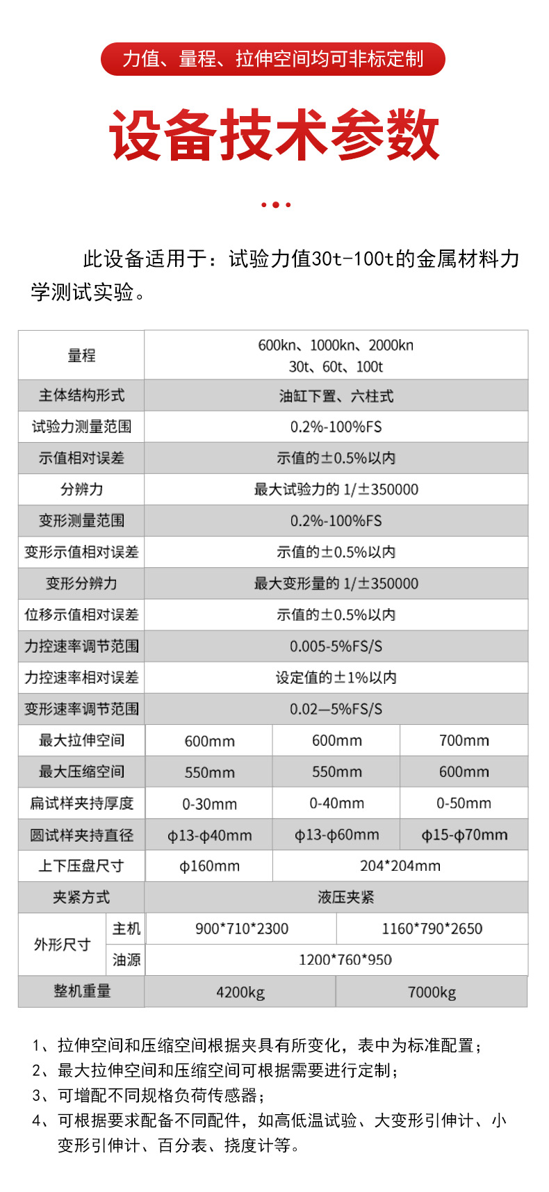 b.当活塞升起达到上极限位置时,行程保护,油泵电机停机。附具全套附具包括:拉伸附具,压缩附具,弯曲附具。